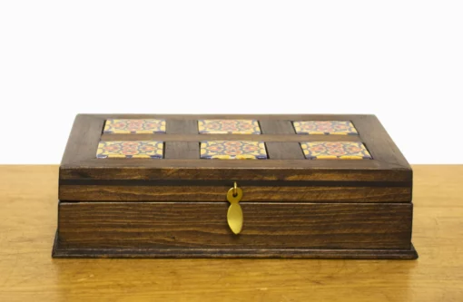 Hermosa caja de madera con 6 azulejos, hecha a mano por artesanos mexicanos en el estado de Michoacán.