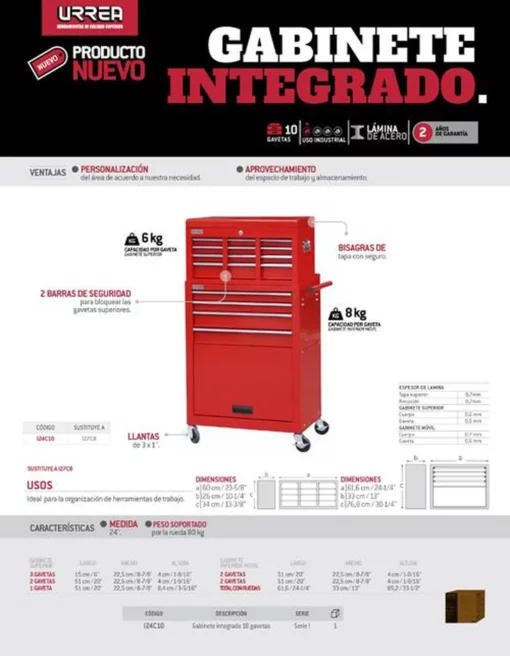 MARCA: Urrea DESCRIPCION DEL PRODUCTO: -Gabinete superior con 6 gavetas, lamina del cuerpo de 0.7 mm y gavetas de 0.5 mm de grosor.-Gabinete inferior con 4 gavetas y un compartimiento, lámina del cuerpo de 0.7 mm y gavetas de 0.5 mm de grosor.-4 ruedas de 3″ x 1″ con 80kg de capacidad cada una.-Bisagras de tapa con seguro. 2 barras de seguridad para bloquear las gavetas superiores.-Fabricado en lamina de acero de alta resistencia.-Gabinete de 24″ de ancho integrado con 10 gavetas. Gabinete superior con 6 gavetas, lámina del cuerpo de 0.7 mm y gavetas de 0.5 mm de grosor. Gabinete inferior con 4 gavetas, lámina del cuerpo de 0.7 mm y gavetas de 0.5 mm de grosor. Móvil con 4 ruedas de 3″ x 1″ con 80kg de capacidad cada una. Bisagras de tapa con seguro. 2 barras de seguridad para bloquear las gavetas superiores. Fabricado en lámina de acero de alta resistencia. ESPECIFICACIONES TECNICAS: CONTENIDO DEL PAQUETE: Gabinete de integrado de 24″ de ancho con 10 gavetas y manual. GARANTIA: 2 Años ALTO EN CM: 68 LARGO EN CM: 39 FONDO EN CM: 84 PESO EN KG: 33.5