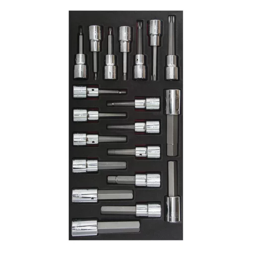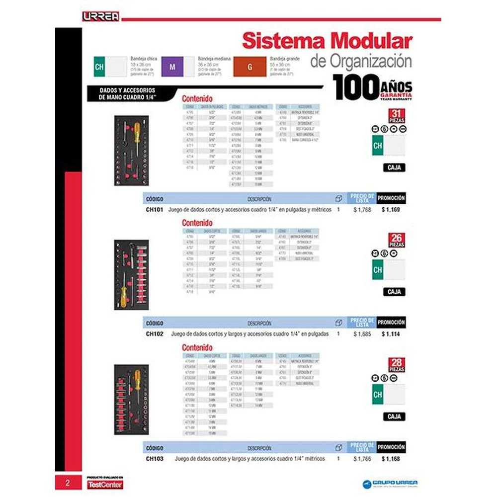 MARCA: Urrea DESCRIPCION DEL PRODUCTO: -Juego industrial de dados con punta de 20 piezas cuadro 1/2″ ESPECIFICACIONES TECNICAS: CONTENIDO DEL PAQUETE: Charola para juego CH110. Dado 1/2″ punta hex 3/8″. Dado 1/2″ punta hex 1/2″. Dado 1/2″ punta hex 1/4″. Dado 1/2″ punta hex 10mm. Dado 1/2″ punta hex 12mm. Dado 1/2″ punta hex 14mm. Dado 1/2″ punta hex 17mm. Dado 1/2″ punta hex 5/16″. Dado 1/2″ punta hex 5/8″. Dado 1/2″ punta hex 6mm. Dado 1/2″ punta hex 7/16″. Dado 1/2″ punta hex 8mm. Dado 1/2″ punta hex 9/16″. Dado 1/2″ punta torx T20. Dado 1/2″ punta torx T25. Dado 1/2″ punta torx T30. Dado 1/2″ punta torx T40. Dado 1/2″ punta torx T45. Dado 1/2″ punta torx T50. Dado 1/2″ punta torx T55. Etiqueta para juego CH110 GARANTIA: 1 año ALTO EN CM: 3.5 LARGO EN CM: 17.5 FONDO EN CM: 36 PESO EN KG: 0.202
