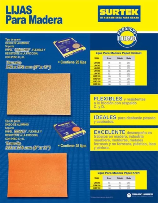 MARCA: Surtek DESCRIPCION DEL PRODUCTO: -Tamaño: 9″ x 11″-Precio por pieza-Resistentes a la fricción con respaldo c-Dureza de 58 hrc.Mango tubular-Grano de óxido de aluminio para madera ESPECIFICACIONES TECNICAS: -Grano: 60-Tamaño: 9 X 11″-Precio De Venta Libre: Si CONTENIDO DEL PAQUETE: Lija madera Kraft grano 60. GARANTIA: ALTO EN CM: 0.05 LARGO EN CM: 27.8 FONDO EN CM: 22.7 PESO EN KG: 0.06